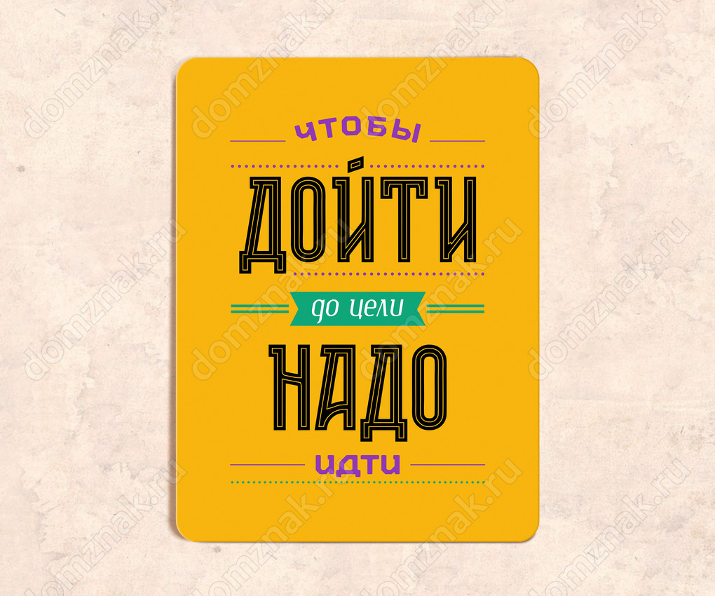 Табличка «Чтобы дойти до цели нужно идти» изготовлена из пластика ПВХ, толщиной 4 мм. Изображение наносится по технологии УФ-печати. Табличка предназначена для использования как в помещении, так и на улице.